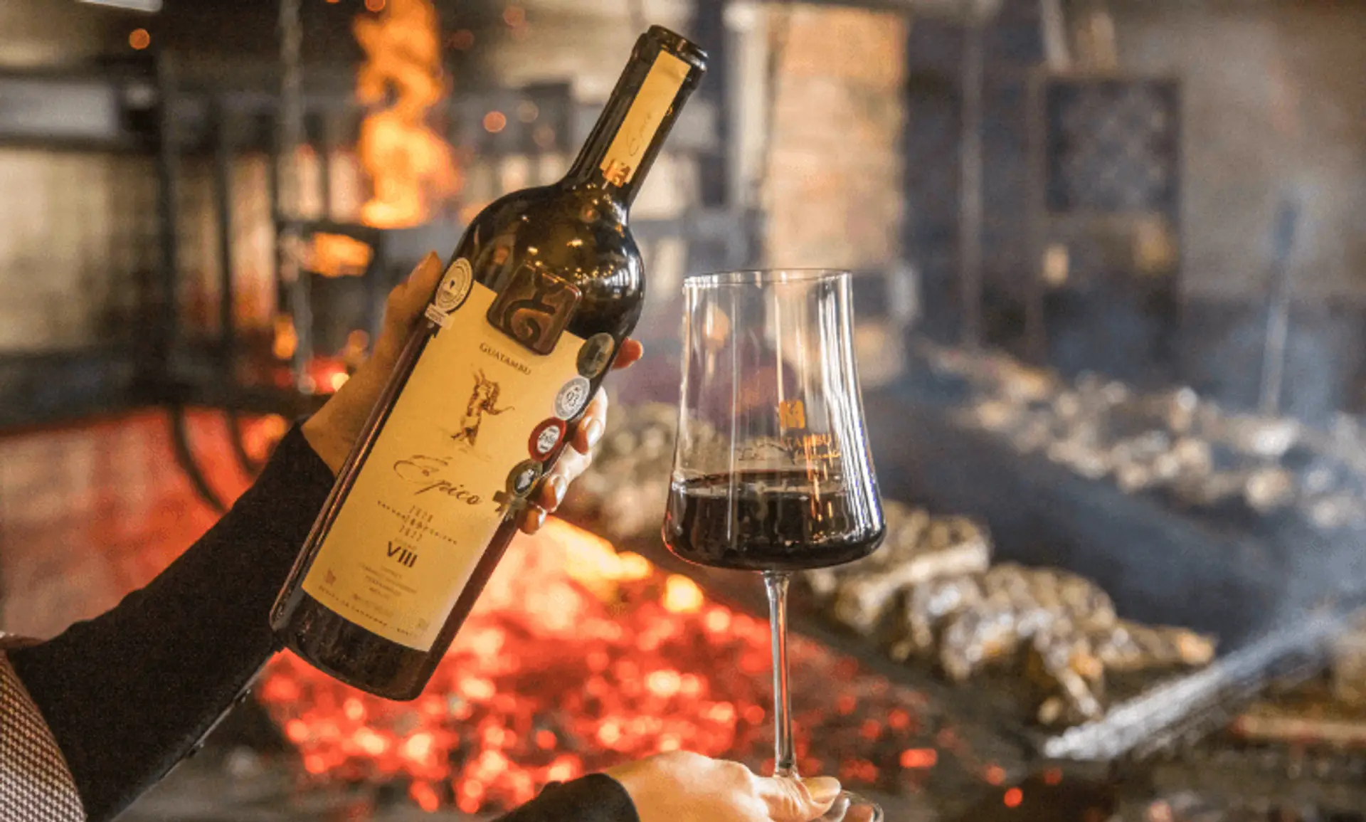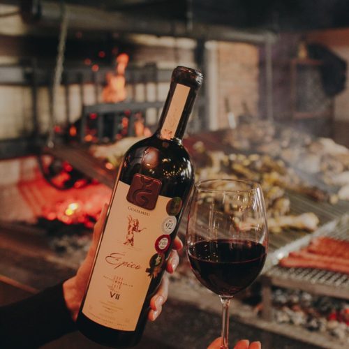 E então, o grande destaque: Almoço harmonizado com parrilla de bife de ancho e assado de tira Hereford, acompanhado por rótulos selecionados da vinícola, incluindo o premiado Épico.